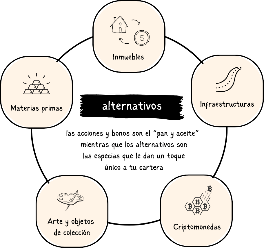 Activos alternativos: Esta clase de activo es como un “cajón de sastre”. Incluye todo tipo de inversiones que no sean acciones ni bonos. El propósito de los alternativos es aumentar la diversificación de tu cartera. En otras palabras, si tus acciones y bonos se desploman al mismo tiempo durante un periodo de crisis, ¿tienes algún otro activo que sea inmune a esa crisis para proteger tu cartera?