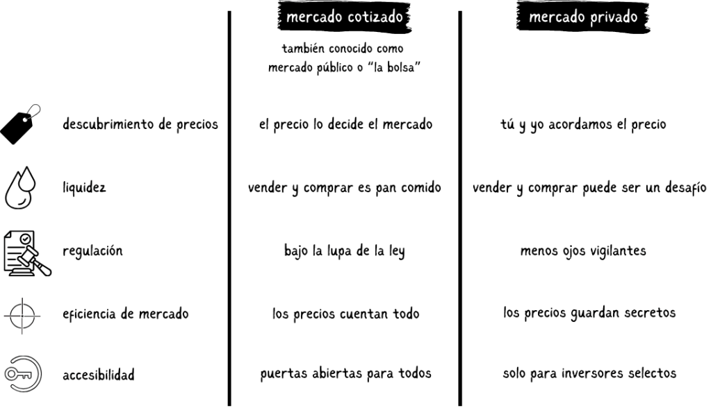 Piensa en el mercado cotizado como un supermercado, mientras que el mercado privado es como hacer la compra en el huerto de un vecino. No es un ejemplo perfecto, pero espero que te ayude a entender la diferencia.