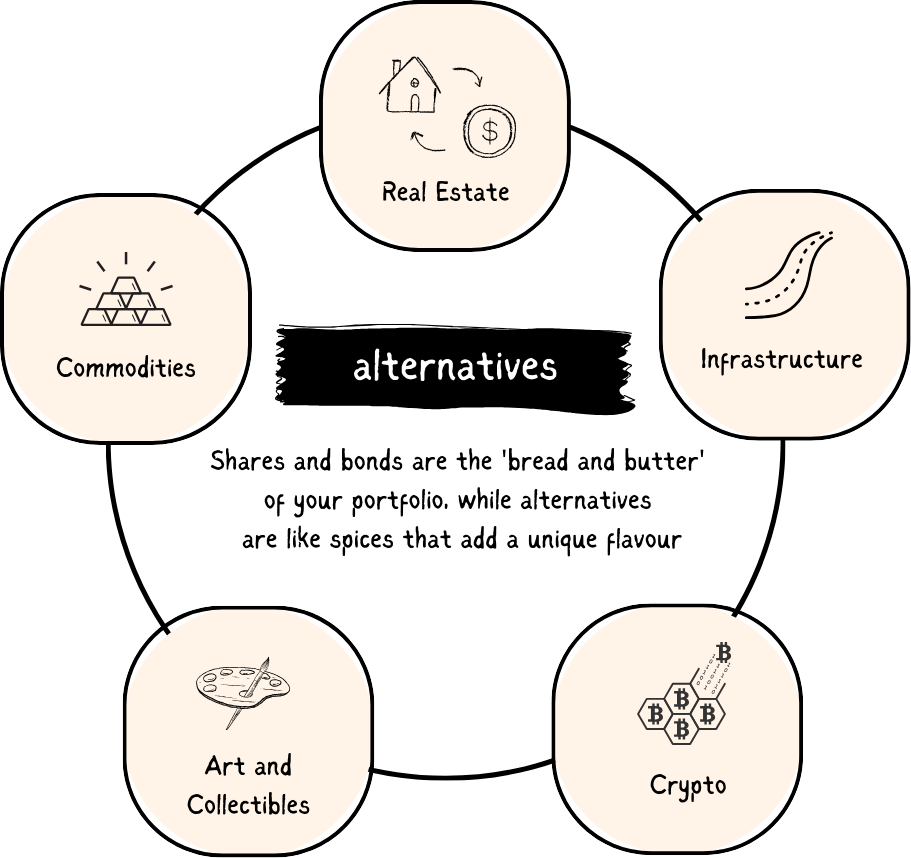 Alternative Assets: This asset class is like a “catch-all”. It includes all types of investments other than shares or bonds. The purpose of alternative assets is to increase the diversification of your portfolio. In other words, if your shares and bonds plummet at the same time during a crisis, do you have any other assets to shield your portfolio from that crisis?