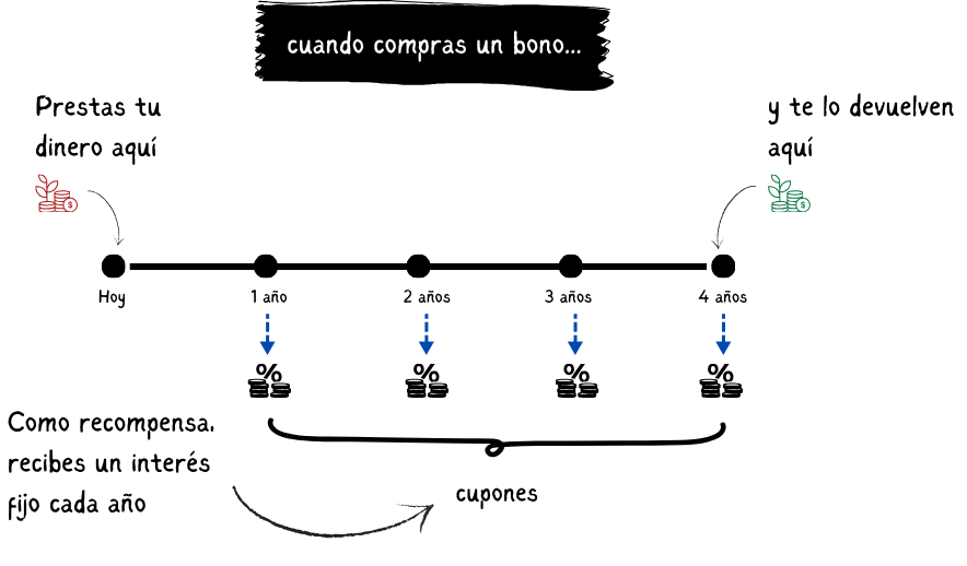 Los bonos se basan en la ‘promesa’ de que el gobierno o la empresa te devolverá el dinero que le has prestado en una fecha específica, así como una rentabilidad fija cada año en forma de intereses, también llamados ‘cupones’.
