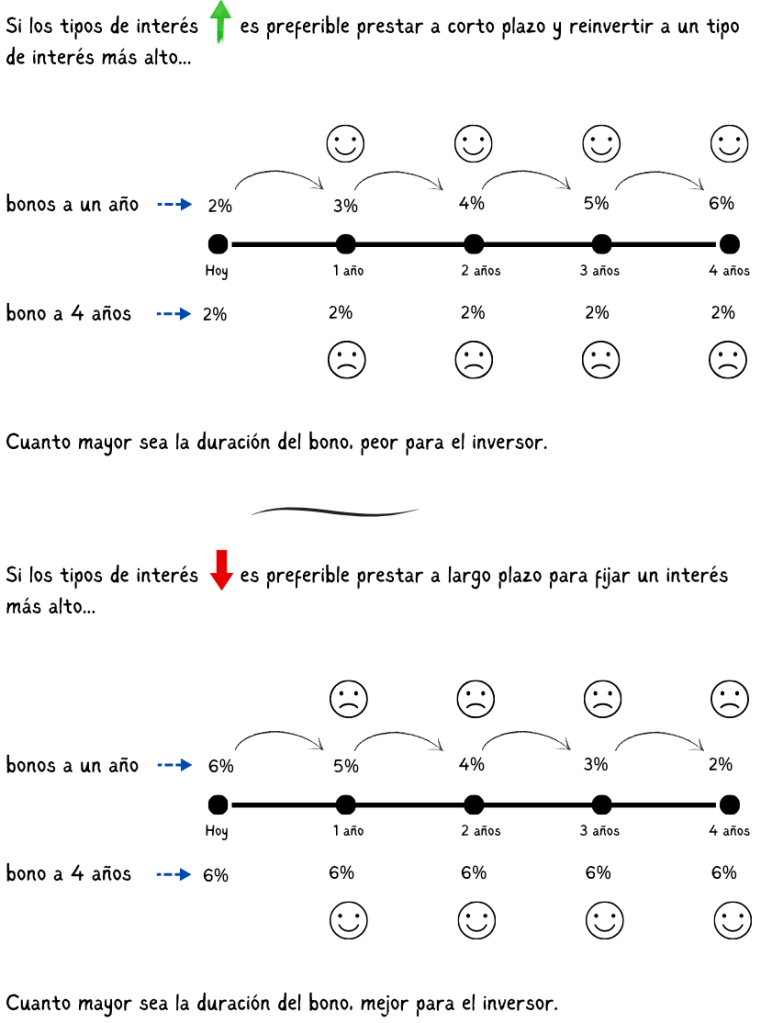 Invertir en bonos sigue una lógica opuesta a pedir una hipoteca: cuando los tipos de interés están bajos, te interesa fijar esa tasa durante el mayor tiempo posible; mientras que cuando los tipos están por las nubes, posiblemente prefieras una hipoteca de tasa variable.