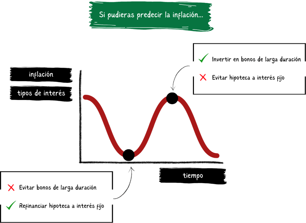 El gráfico hace que parezca sencillo, pero en realidad nunca sabrás con certeza cuándo es el mejor momento para invertir en bonos de larga duración o refinanciar tu hipoteca; siempre existe la posibilidad de que los tipos de interés sigan subiendo o sigan bajando. Sin embargo, es importante entender los factores que influyen en el precio de los bonos y cuándo las probabilidades están a tu favor.