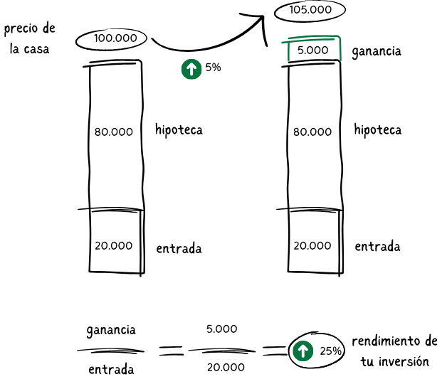 Si el precio aumenta un 5% el próximo año, la casa pasaría a valer 105.000 euros. Es decir, tendrías una ganancia de 5.000 euros. Como tú solo has invertido los 20.000 de la entrada, esto significa que tu inversión ha crecido un 25%. Por tanto, el crecimiento de tu inversión (25%) es cinco veces más alto que el aumento en el precio de la vivienda (5%). Así es como el apalancamiento multiplica el rendimiento de tu inversión.