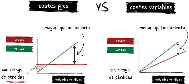 Para entender el efecto del apalancamiento en las empresas, comparemos dos tipos de negocios: uno con solo costes fijos y otro con solo costes variables.
