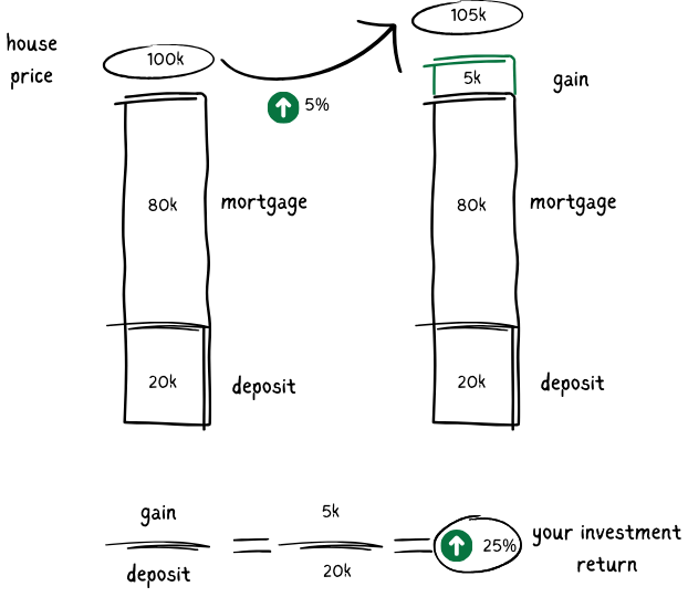 If the price increases by 5% next year, the house would be worth £105,000. That means you would have a gain of £5,000. Since you only invested the £20,000 deposit, it means your investment has grown by 25%. Therefore, the growth of your investment (25%) is five times higher than the growth of the property price (5%). That’s how leverage multiplies the return on your investment.