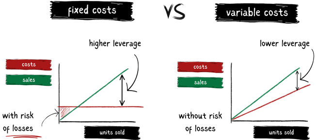 To understand the effect of leverage on businesses, let’s compare two types: one with only fixed costs and the other with only variable costs.