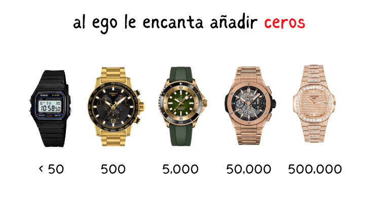 La tentación existe para todos los bolsillos. Si tienes un reloj de 100 euros, puedes aspirar a uno de 500. Mientras que si tienes uno de 500, aspiras a uno de 2.000. Y así sucesivamente, hasta llegar a millones de euros. En el ámbito del ego, los precios crecen de forma exponencial.