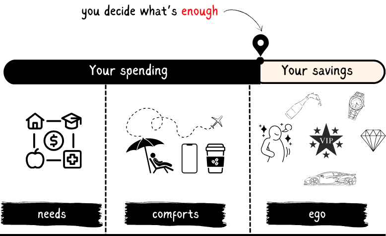 Ego: These are the expenses that masquerade as “comforts” but, in reality, aim to project an image of success to others. Social status and hierarchy have always been important to humans, and it would be naive to think that these impulses don’t influence our spending.