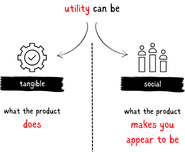 The products you buy offer utility. This means they improve your life in some way. While some products offer tangible utility (like a mattress), others offer intangible or social utility. The price of a Rolex, for example, is not justified by its ability to tell time but by its utility in terms of status.
