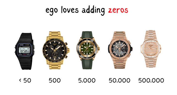 The temptation exists for every budget. If you have a £100 watch, you might aspire to a £500 one. If you have a £500 one, you might aspire to a £5,000 one. And so on, until you reach millions of pounds. In the realm of ego, prices increase exponentially.
